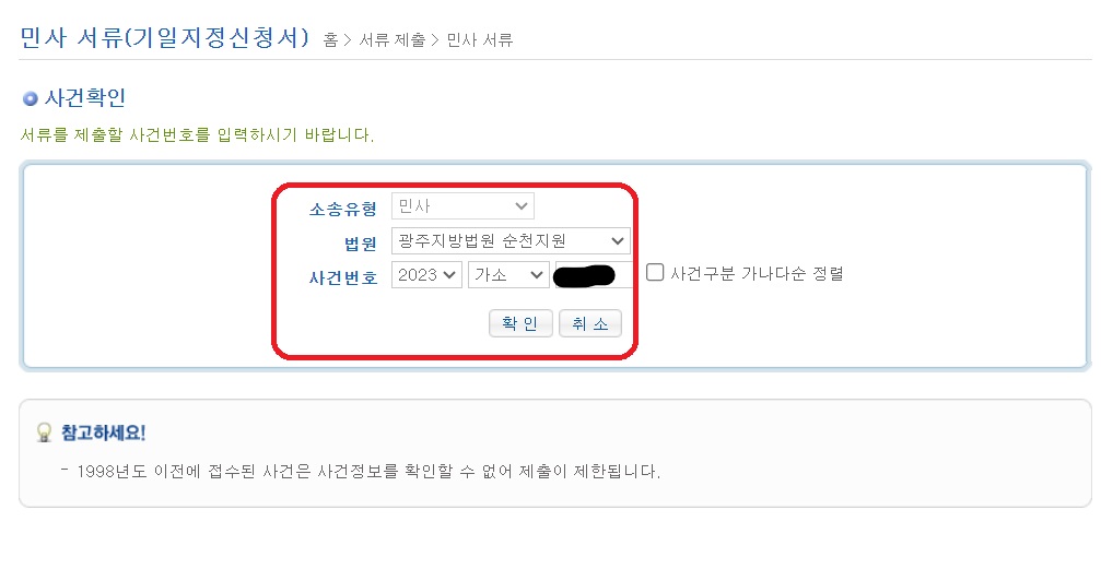8. 소송유형 [민사] , 법원 [해당법원] , 사건번호 확인합니다.