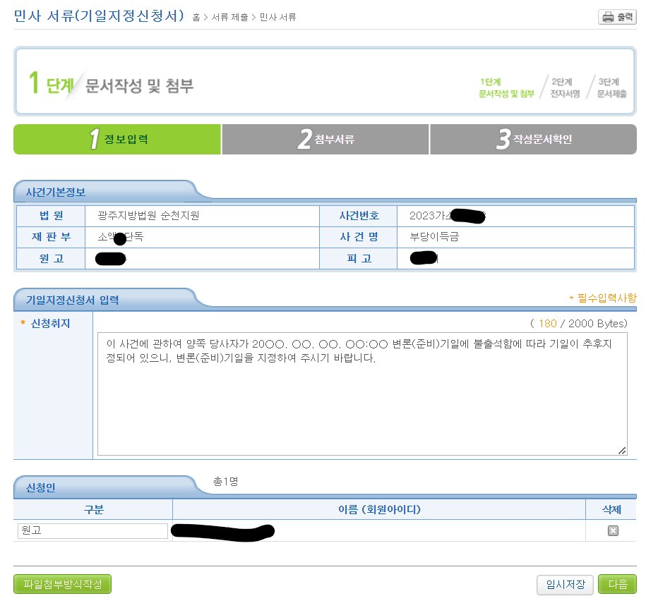 한글파일로 작성한 기일지정신청서라면 '파일첨부방식작성'을 통해서 첨부하시면 됩니다.