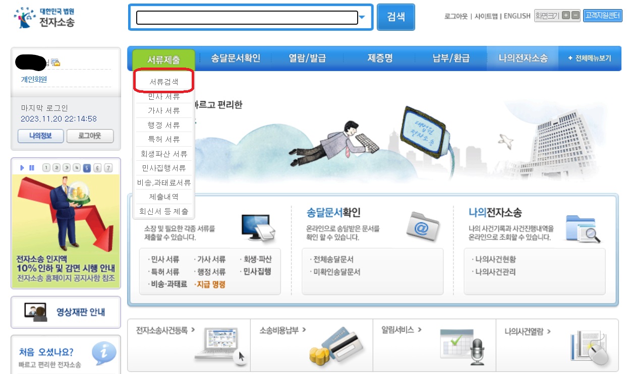 1. 대법원 전자소송 사이트를 접속하고 로그인합니다.