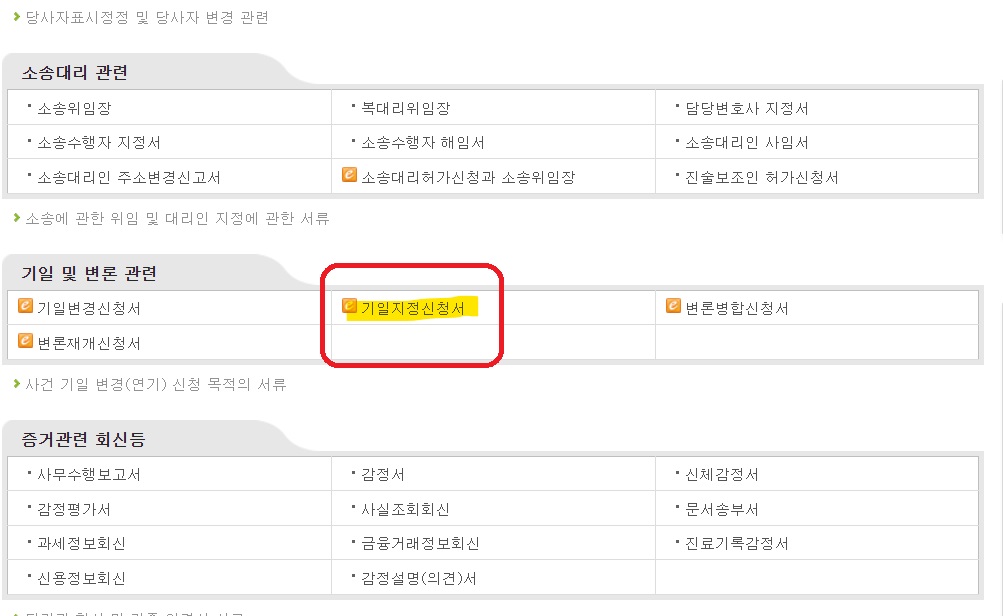 3. 하단으로 쭉 내려와 [기일 및 변론 관련] - [기일지정신청서] 선택합니다.