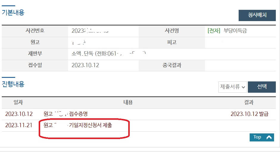 10. 마지막으로 기일지정신청서 제출 후 대법원 전자소송 사이트에서 신청서 제출이 잘 되었는지 확인할 수 있었습니다.